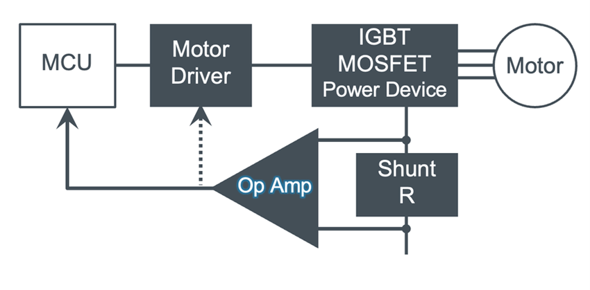 图1:分流电阻可产生与电流成正比的电压降,并将该电压放大后反馈至微控制器,从而被用来实现控制和保护功能。