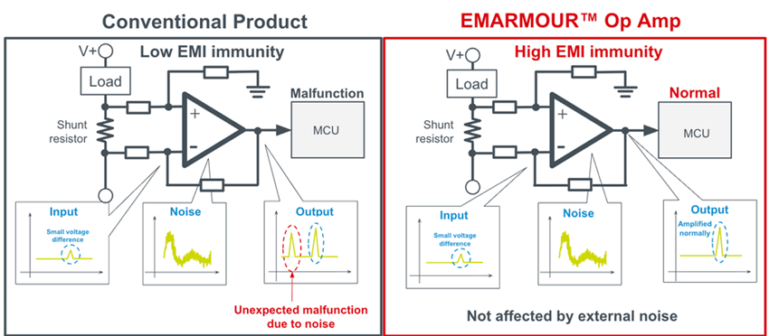 图4:在该比较图中,传统运算放大器容易因噪声干扰而误动作,ROHM的EMARMOUR™运算放大器可保持稳定且高精度的信号放大功能。